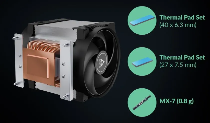 A Freezer 4U-OneX nemcsak MX-7 hővezető pasztát tartalmaz, amelyet a chipre kell felvinni, hanem hővezető párnákat is, amelyeket a környező IHS-re helyeznek a teljes hőlefedettség biztosítása érdekében.