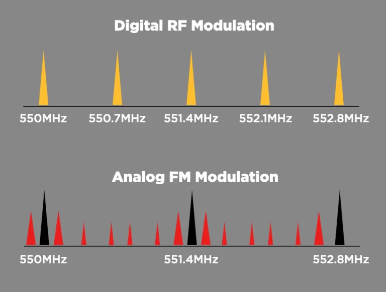 A THEOS rendszer digitális RF modulációja miatt a rendszer intermodulációmentes. Az analóg vezeték nélküli mikrofonokkal ellentétben, amelyek harmonikusokat hoznak létre, a THEOS adó RF jele csak egyetlen csúcsot hoz létre.